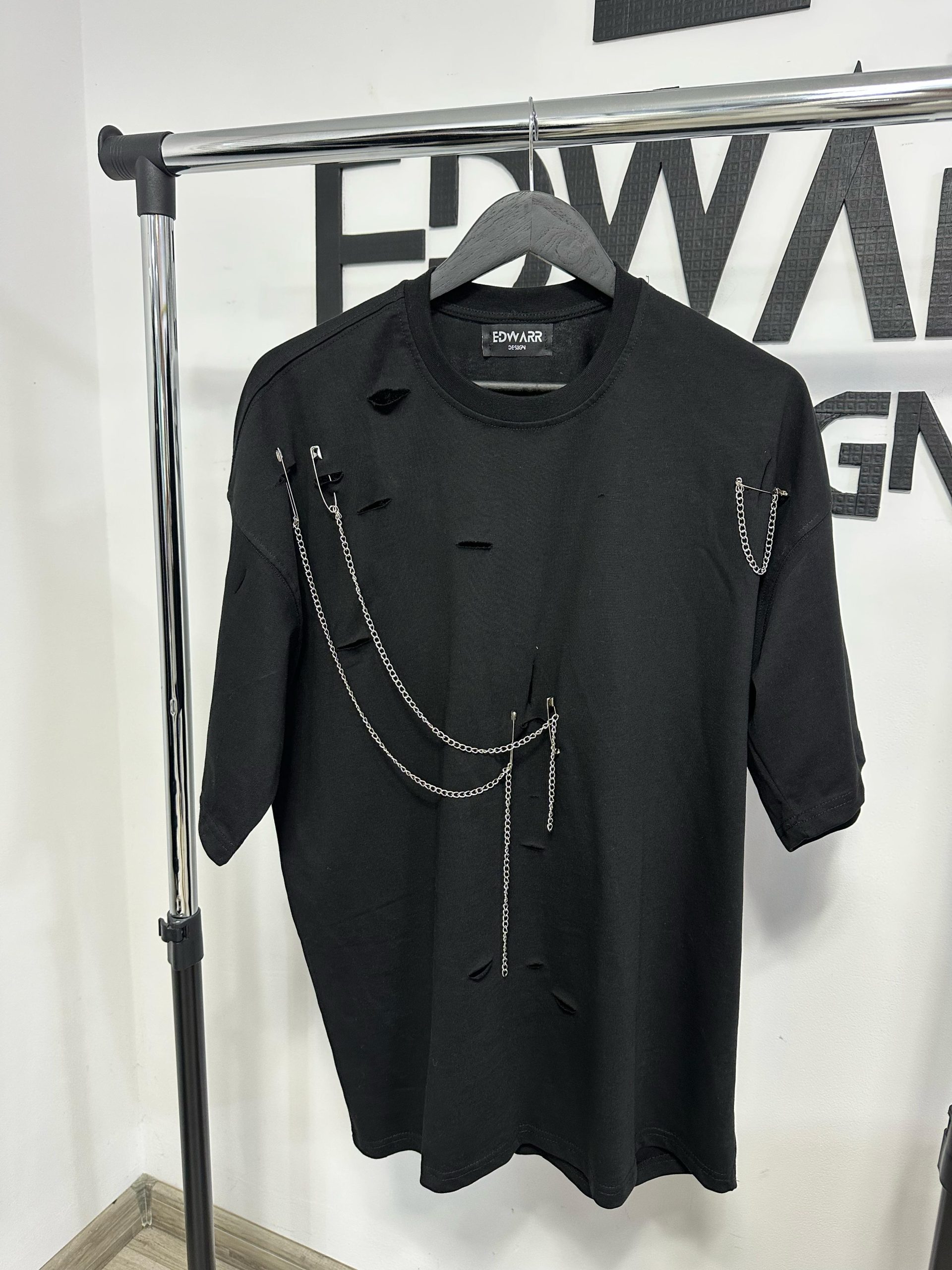 Tricoul este din 100% bumbac, cu un croi lejer și elemente decorative din lanțuri metalice.