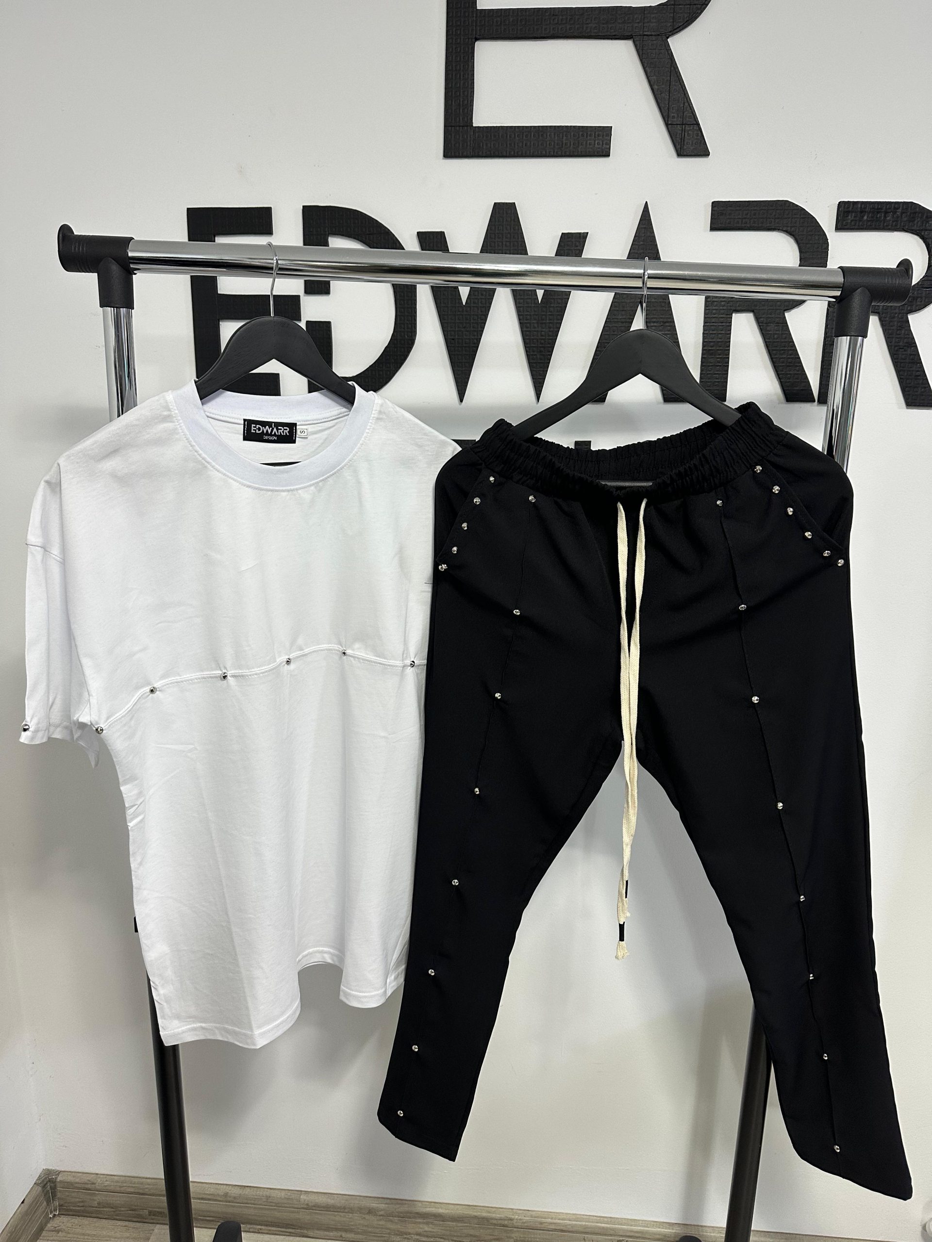 Un compleu fresh și confortabil – pantaloni lejeri dar bine structurați, combinați cu un tricou din bumbac subțire și ușor. Țintele aplicate adaugă un detaliu cool, fără să încarce. Perfect pentru zilele călduroase când vrei să arăți bine, dar să te simți și liber.