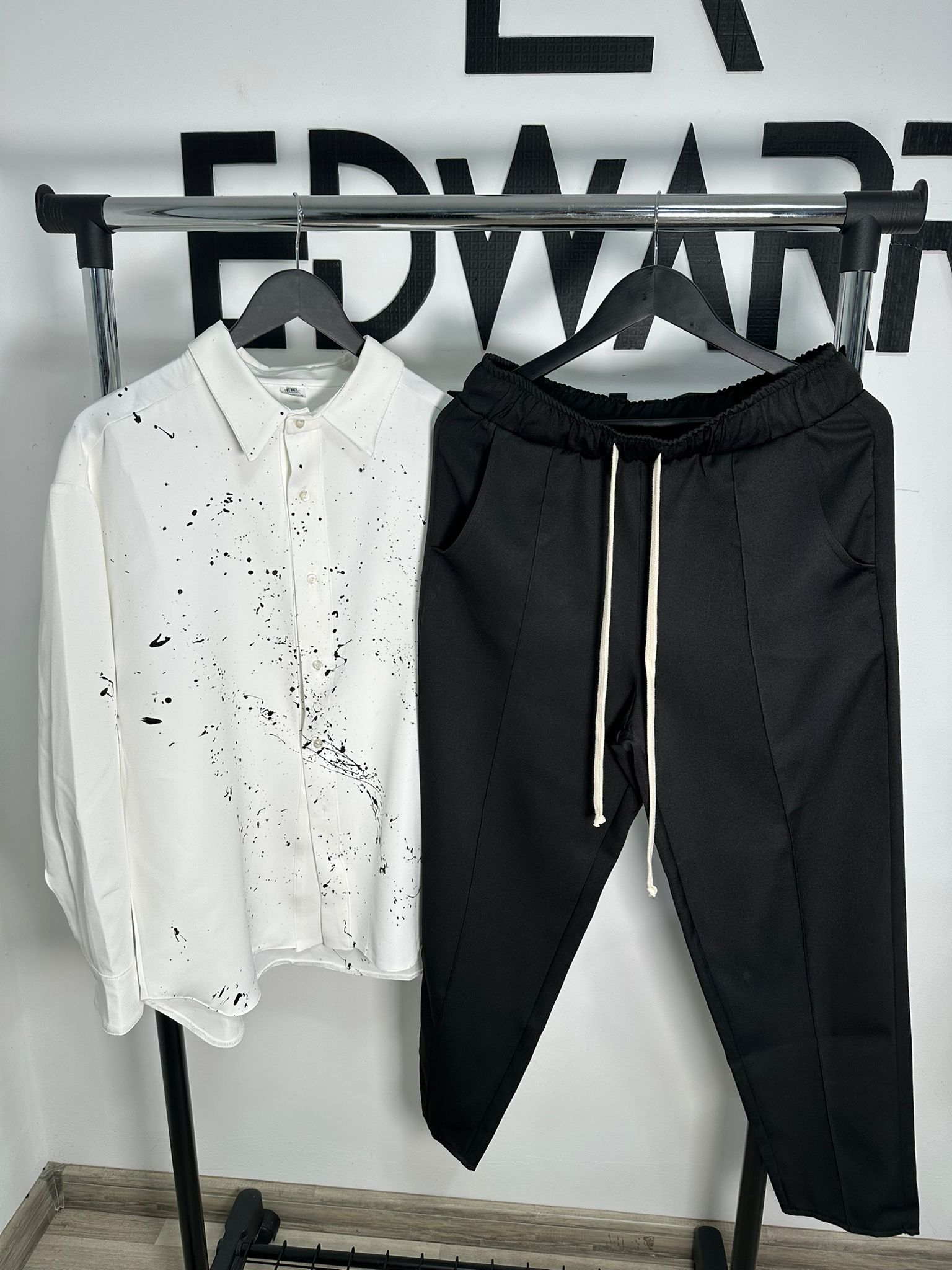 Piesa este pictată manual, fiecare model fiind aplicat individual, ceea ce transformă cămașa într-un produs one of a kind. Contrastul dintre baza albă curată și intervențiile artistice oferă un look modern, expresiv, fără a deveni excesiv.