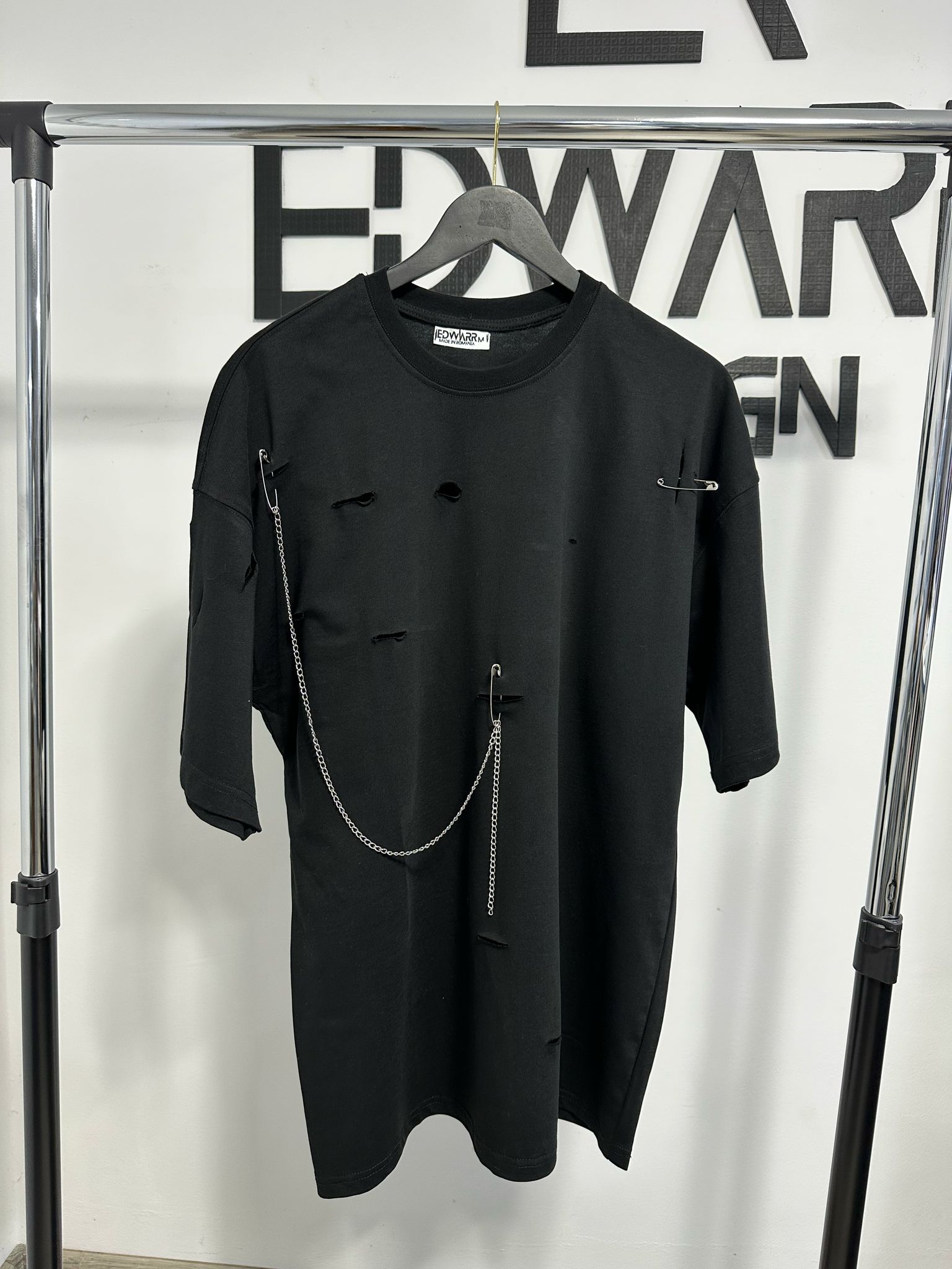Tricoul CUT Black și redefinește stilul casual cu un design urban, detalii distressed și un lanț metalic subtil, adăugând un touch nonconformist oricărui outfit. Confecționat din bumbac moale și respirabil, acest tricou oversized oferă libertate de mișcare și un look effortless cool.
